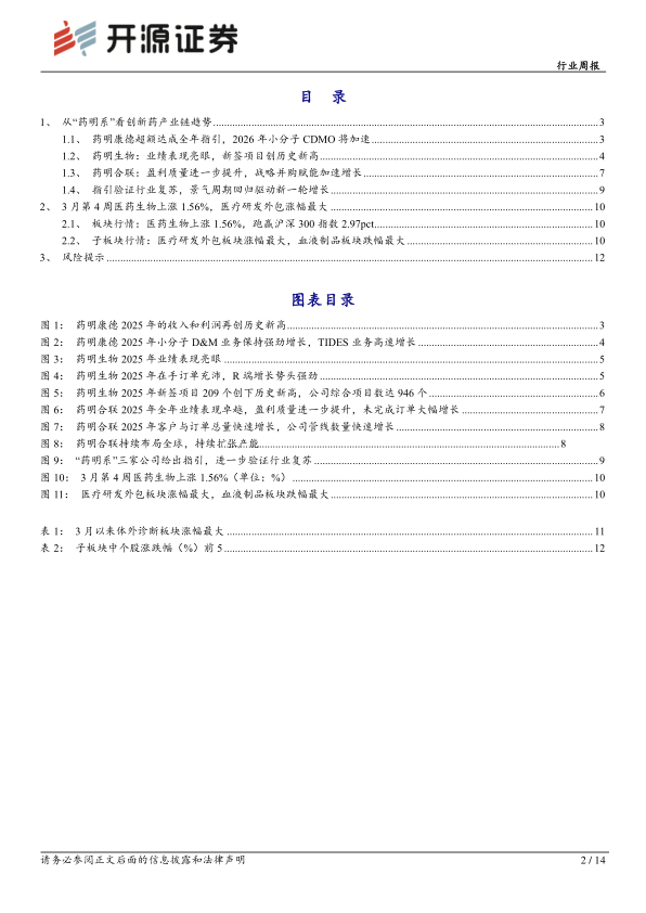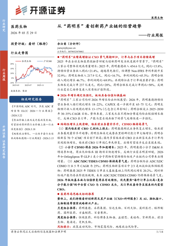 “药明系”三家公司均对2026年增长给出积极展望:2026年,药明康德持续经营业务收入指引同比增长18–22%,CAPEX进一步提升至65–75亿元;药明生物预计收入实现同比增长13–17%(已包含汇率影响);药明合联设立2025–2030年30–35%CAGR目标。整体来看,三家龙头在不同细分赛道均给出较强增长指引,反映CXO在订单、产能与需求端共振下的景气延续性进一步强化。