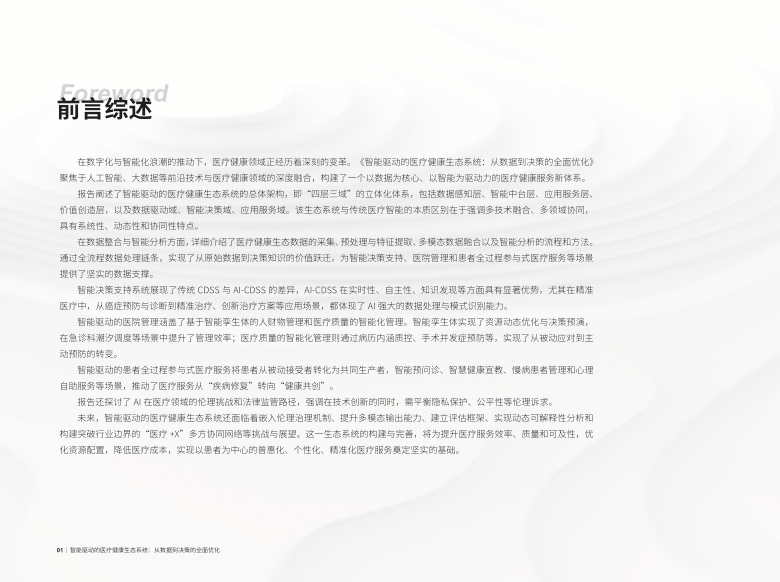 在数字化与智能化浪潮的推动下,医疗健康领域正经历着深刻的变革。《智能驱动的医疗健康生态系统:从数据到决策的全面优化》聚焦于人工智能、大数据等前沿技术与医疗健康领域的深度融合,构建了一个以数据为核心、以智能为驱动力的医疗健康服务新体系。报告阐述了智能驱动的医疗健康生态系统的总体架构,即“四层三域”的立体化体系,包括数据感知层、智能中台层、应用服务层、价值创造层,以及数据驱动域、智能决策域、应用服务域。该生态系统与传统医疗智能的本质区别在于强调多技术融合、多领域协同,具有系统性、动态性和协同性特点。