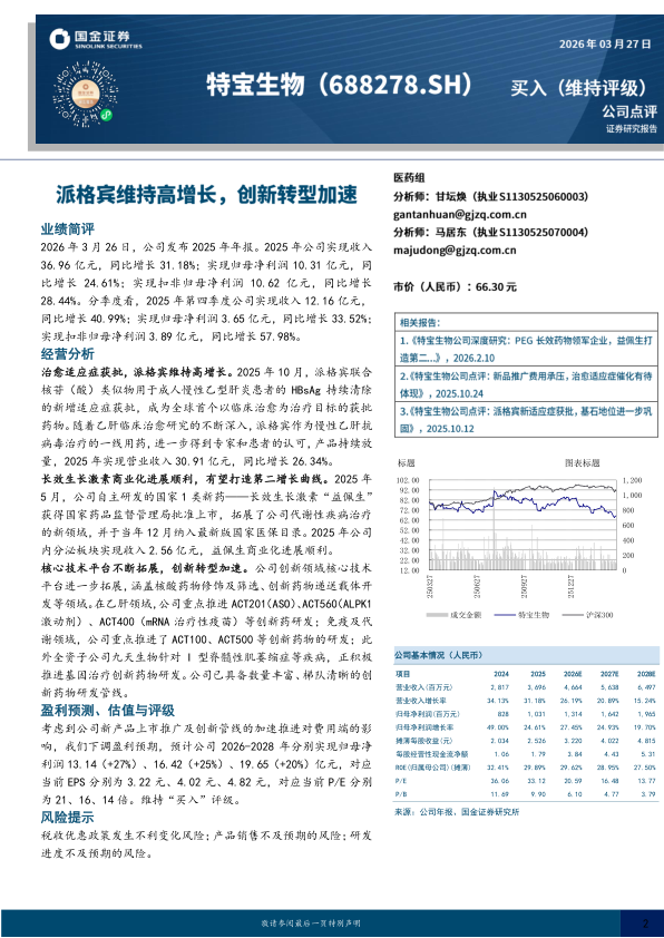 考虑到公司新产品上市推广及创新管线的加速推进对费用端的影响,我们下调盈利预期,预计公司2026-2028年分别实现归母净利润13.14(+27%)、16.42(+25%)、19.65(+20%)亿元,对应当前EPS分别为3.22元、4.02元、4.82元,对应当前P/E分别为21、16、14倍。维持“买入”评级。