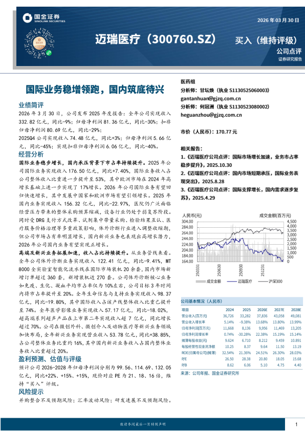 国际业务稳步增长,国内承压背景下市占率持续提升。2025年公司国际业务实现收入176.50亿元,同比+7.40%,国际业务收入占公司整体收入比重进一步提升至53%,其中欧洲市场在2024年高增长基础上进一步实现了17%增长。2026年公司国际业务有望回归快速增长,其中发展中国家和欧洲市场有望引领增长。2025年国内业务实现收入156.32亿元,同比-22.97%,医院仍广泛面临经营压力带来的整体采购预算缩减,设备行业仍处于弱复苏阶段。同时受DRG支付方式改革、试剂集中带量采购、检验结果互认、医疗服务价格治理等多重政策影响,体外诊断行业进入调整收缩期,但公司市场占有率明显增长,国内新兴业务也表现出高增长潜力,2026年公司国内业务有望实现正增长。