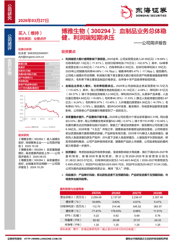 投资建议:考虑到血制品市场竞争加剧,受政策影响较大等因素,我们下调2026-2027年盈利预测,新增2028年盈利预测,预计公司2026-2028年实现营收分别为21.38/22.36/23.57亿元,归母净利润分别为3.14/3.46/3.84亿元(2026-2027年原预测为5.49/6.65亿元),对应EPS分别为0.62/0.69/0.76元,对应PE分别为29.68/27.01/24.33倍。公司为国内血制品领域的优质企业,维持“买入”评级。