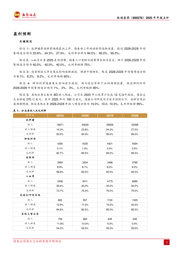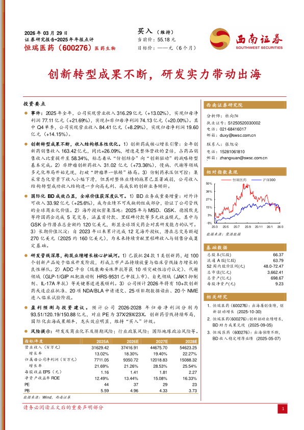 盈利预测与投资建议。预计公司2026-2028年归母净利润分别为93.51/120.19/150.88亿元,对应PE为37X/29X/23X。创新药管线持续布局,国际化出海成果颇丰,龙头效应明显,维持“买入”评级。