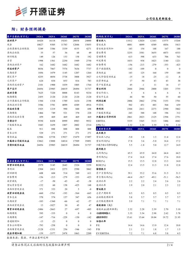 分业务来看,公司2025化学制剂62.22亿元(+1.67%),其中消化道产品25.20亿元(-1.81%),促性激素产品29.04亿元(+3.25%),精神产品6.28亿元(+3.54%),抗感染及其他产品1.70亿元(+26.75%);原料药中间体31.17亿元(-4.23%);中药16.74亿元(+18.81%);生物制品2.01亿元(+17.5%)。我们看好公司创新和国际化的布局优势,但基于IL-17A/F等新品推广放量仍需时间,下调2026-2027年并新增2028年盈利预测,预计2026-2028年归母净利润分别为21.25、23.94、27.51亿元(原2026-2027年预测为25.21、28.01亿元),EPS分别为2.39、2.70、3.10元/股,当前股价对应PE为13.9、12.4、10.8倍,维持“买入”评级。