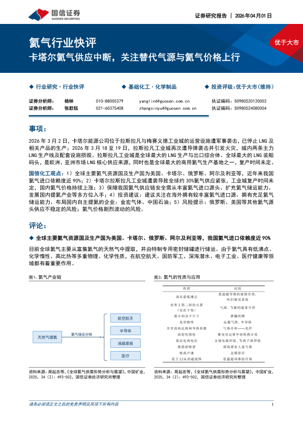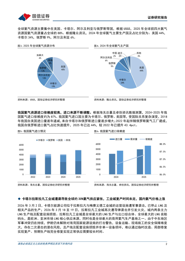 国信化工观点:1)全球主要氦气资源国及生产国为美国、卡塔尔、俄罗斯、阿尔及利亚等,近年来我国氦气进口依赖度近90%;2)卡塔尔拉斯拉凡工业城遭袭导致全球约30%氦气供应紧张,工业城复产时间未定,国内氦气价格持续上涨;3)保障我国氦气供应链安全需从丰富氦气进口源头、扩充氦气储运能力、发展国内提氦产业等多方位入手;4)投资建议:建议关注在海外拥有较丰富氦气进口源、拥有充足氦气储运能力、布局国内自主提氦的企业:金宏气体、中国石油;5)风险提示:俄罗斯、美国等其他氦气源头供应不稳定的风险;氦气价格剧烈波动的风险。