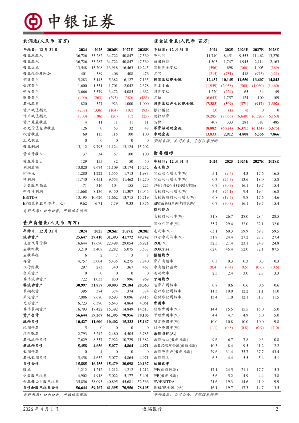 考虑到DRG/DIP支付方式改革、试剂集中带量采购等多重政策影响,IVD行业进入调整收缩期,同时,设备行业处于弱复苏状态。基于此我们下调公司盈利预测,预计2026-2028年公司归母净利润为94.50/113.07/130.45亿元(原2026-2027年预测为160.89/172.13亿元);对应EPS分别为7.79/9.33/10.76元,截止到3月31日收盘价,对应PE为21.1/17.7/15.3倍。公司海外业务稳步推进,国内业务筑底回升,新业务快速发展叠加数智化放量,公司业绩有望恢复快速增长,维持买入评级。