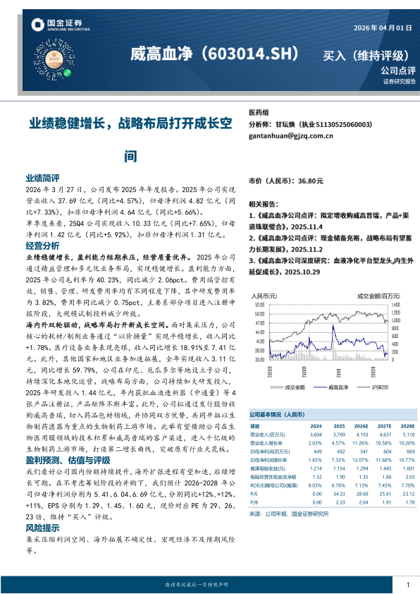 我们看好公司国内份额持续提升,海外扩张进程有望加速,后续增长可期。在不考虑筹划阶段的并购下,我们预计2026-2028年公司归母净利润分别为5.41、6.04、6.69亿元,分别同比+12%、+12%、+11%,EPS分别为1.29、1.45、1.60元,现价对应PE为29、26、23倍,维持“买入”评级。