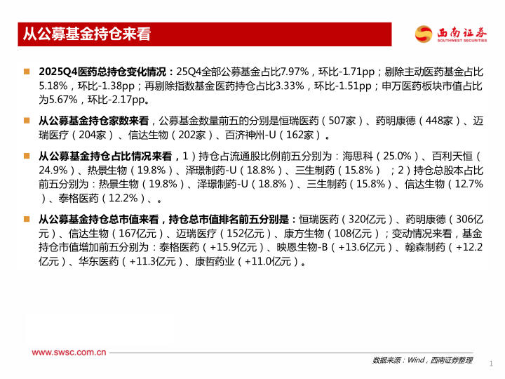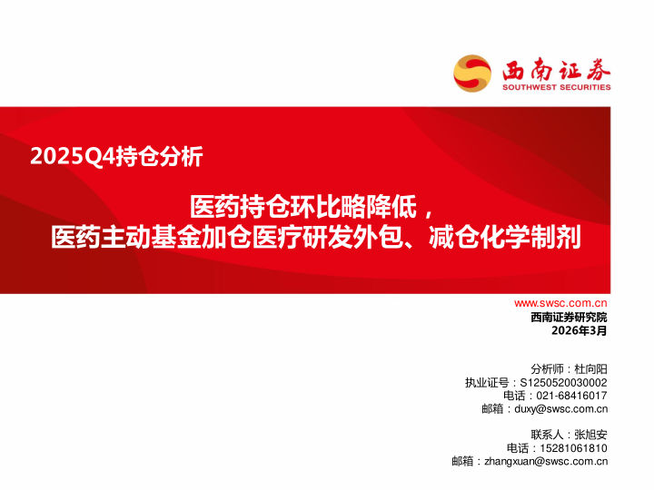 医药2025Q4持仓分析:医药持仓环比略降低,医药主动基金加仓医疗研发外包、减仓化学制剂