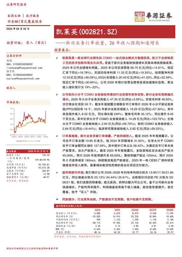 凯莱英是一家全球行业领先的CDMO一站式综合解决方案提供商,致力于全球制药工艺的技术创新和商业化应用。受益于新兴业务板块快速增长及降本增效措施成果,2025年公司业绩增长明显。2025年公司实现营收66.70亿元(同比+14.91%,恒定汇率下同比+16.78%),实现归母净利润11.33亿元(同比+19.35%),经调整净利润12.53亿元(同比+56.09%)。25Q4实现收入20.40亿元(环比+41.53%,同比+22.59%,恒定汇率下同比+30.84%)。公司2026年预计经营业绩将呈现加速增长态势,营业收入增长预计为19%-22%。