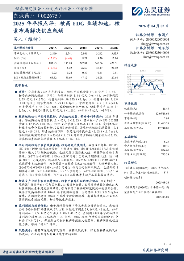 盈利预测与投资评级:由于原料药价格下滑及考虑公司资金需求,我们将公司2026-2027年营收从37.1/41.9亿元下调至29.66/32.42亿元,归母净利润从3.2/4.0亿元下调至2.48/3.41亿元,并预测2028年营收和归母净利润分别为36.35亿元和4.23亿元;2026-2028年对应当前股价PE分别为47/34/28×。考虑到公司创新核药管线进入收获期,核药网络化供应能力强,维持“买入”评级。