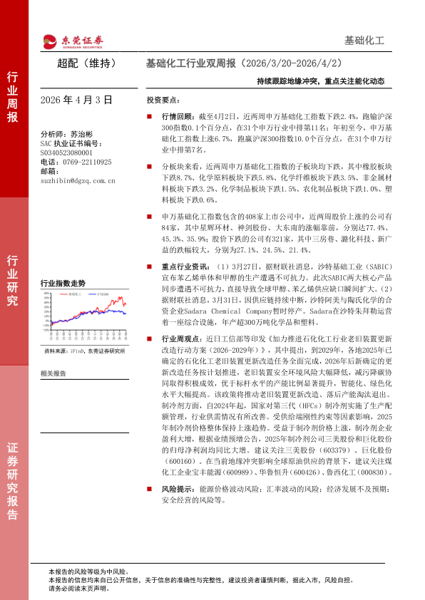 行业周观点:近日工信部等印发《加力推进石化化工行业老旧装置更新改造行动方案(2026-2029年)》,其中提出,到2029年,各地2025年已确定的石化化工老旧装置更新改造任务全面完成,2026年后新确定的更新改造任务按计划推进,老旧装置安全环境风险大幅降低,减污降碳协同取得积极成效,优于标杆水平的产能比例显著提升,智能化、绿色化水平大幅提高。该政策将推动老旧装置更新改造、落后产能淘汰退出。制冷剂方面,自2024年起,国家对第三代(HFCs)制冷剂实施了生产配额管理,行业供需情况有所改善。受供给端刚性约束等因素影响,2025年制冷剂价格整体保持上涨趋势。受益于制冷剂价格上涨,制冷剂企业盈利大增,根据业绩预增公告,2025年制冷剂公司三美股份和巨化股份的归母净利润均同比大增。建议关注三美股份(603379)、巨化股份(600160)。在当前地缘冲突影响全球原油供应的背景下,建议关注煤化工企业宝丰能源(600989)、华鲁恒升(600426)、鲁西化工(000830)。
