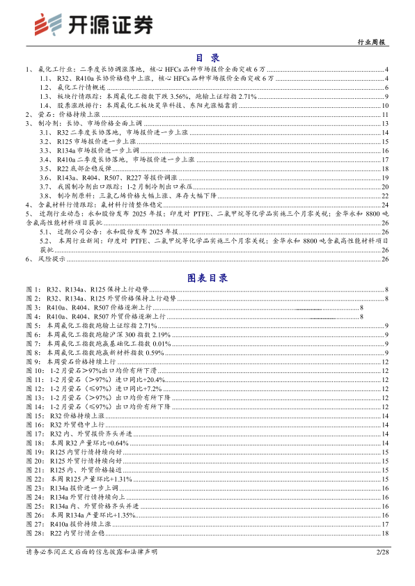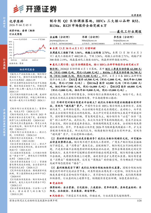 氟化工行业周报:制冷剂Q2长协调涨落地,HFCs三大核心品种R32、R134a、R125市场报价全面突破6万