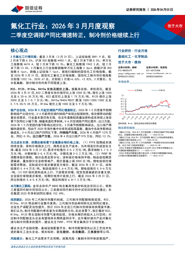 氟化工行业:2026年3月月度观察:二季度空调排产同比增速转正,制冷剂价格继续上行