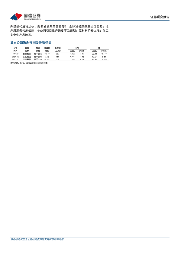 风险提示:氟化工产品需求不及预期;政策风险(氟制冷剂环保政策趋严、升级换代进程加快、配额发放政策变更等);全球贸易摩擦及出口受阻;地产周期景气度低迷;各公司项目投产进度不及预期;原材料价格上涨;化工安全生产风险等。