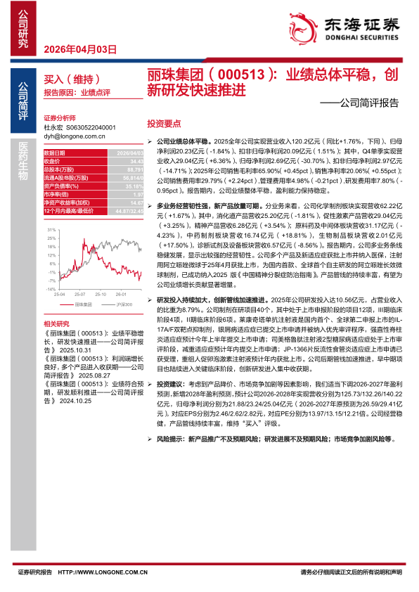 投资建议:考虑到产品降价、市场竞争加剧等因素影响,我们适当下调2026-2027年盈利预测,新增2028年盈利预测,预计公司2026-2028年实现营收分别为125.73/132.26/140.22亿元,归母净利润分别为21.88/23.24/25.04亿元(2026-2027年原预测为26.59/29.41亿元),对应EPS分别为2.46/2.62/2.82元,对应PE分别为13.97/13.15/12.21倍。公司经营稳健,产品管线持续丰富,维持“买入”评级。