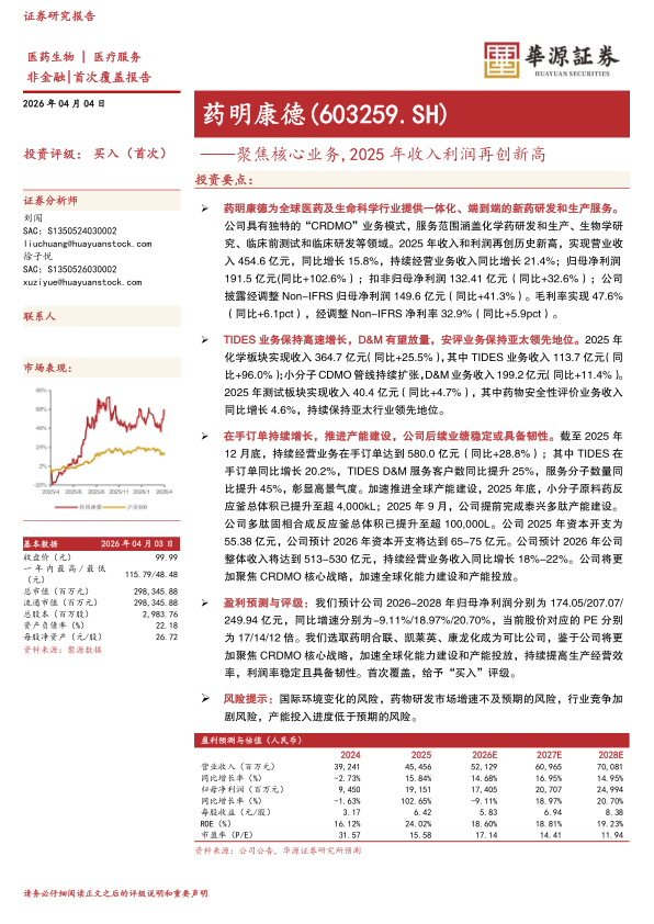 公司具有独特的“CRDMO”业务模式,服务范围涵盖化学药研发和生产、生物学研究、临床前测试和临床研发等领域。2025年收入和利润再创历史新高,实现营业收入454.6亿元,同比增长15.8%,持续经营业务收入同比增长21.4%;归母净利润191.5亿元(同比+102.6%);扣非归母净利润132.41亿元(同比+32.6%);公司披露经调整Non-IFRS归母净利润149.6亿元(同比+41.3%)。毛利率实现47.6%(同比+6.1pct),经调整Non-IFRS净利率32.9%(同比+5.9pct)。