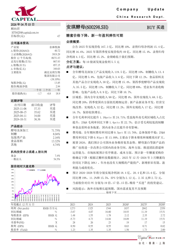 展望2026,我们预计公司国内业务维持复苏态势,酵母蛋白等新产品的推广也将进一步改善公司国内的业务空间,海外方面,推进团队搭建和运营能力,市场拓展预计有序推进。成本方面,预计新一年糖蜜采购价格确定下降(根据泛糖科技数据统计,2025年12月-2026年3月糖蜜均价同比下降近30%),年内也没有大规模的产能投产,新增折旧有限,盈利能力或将优化。