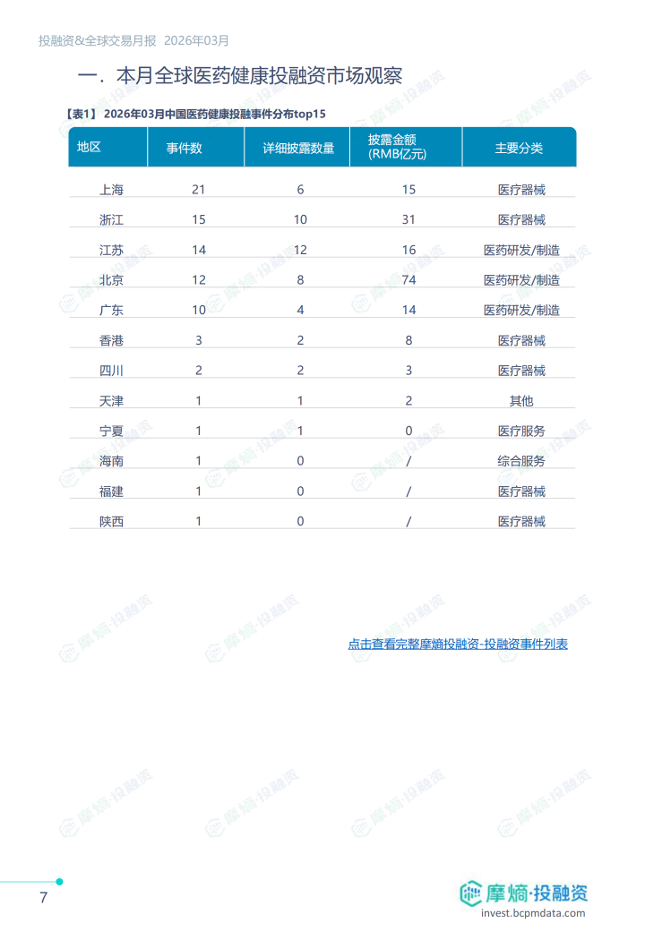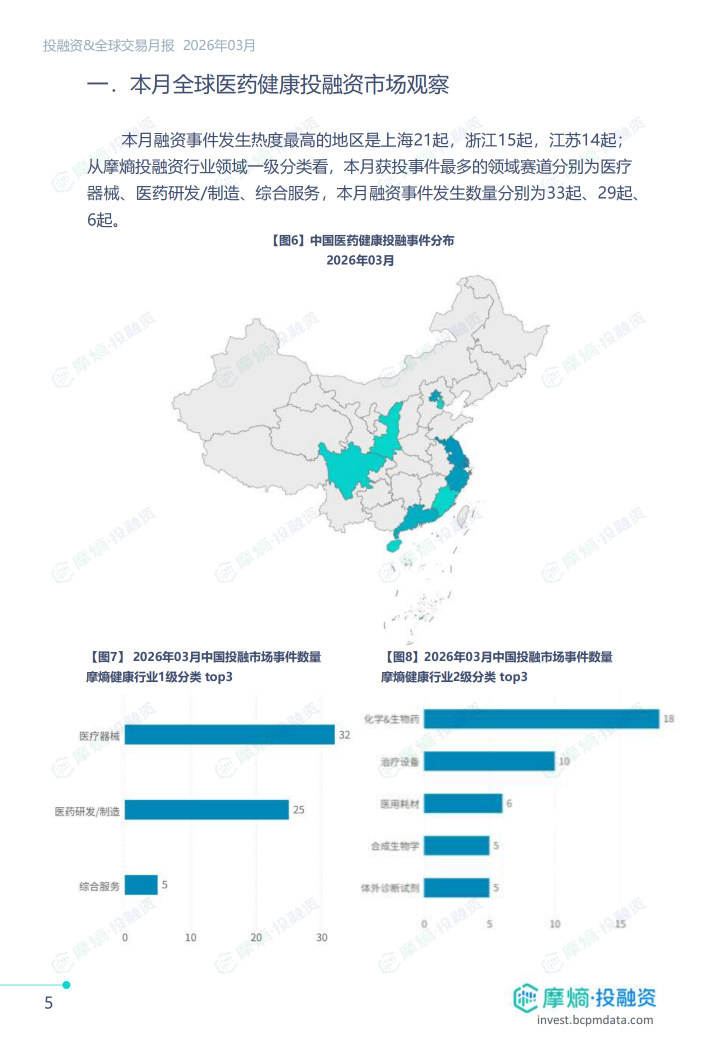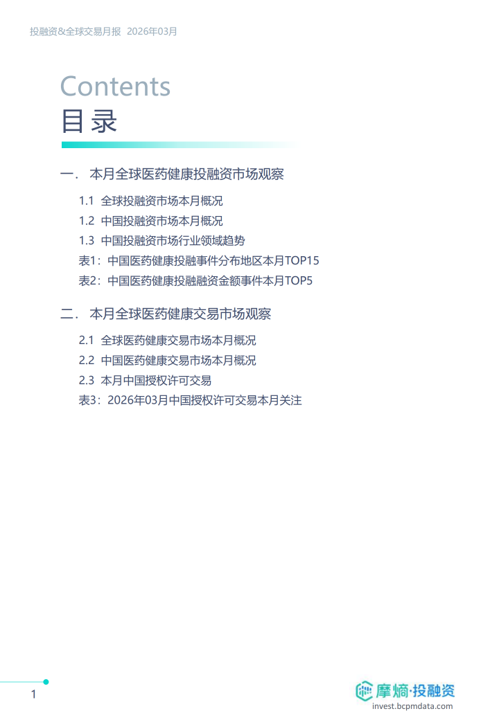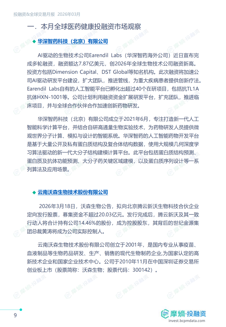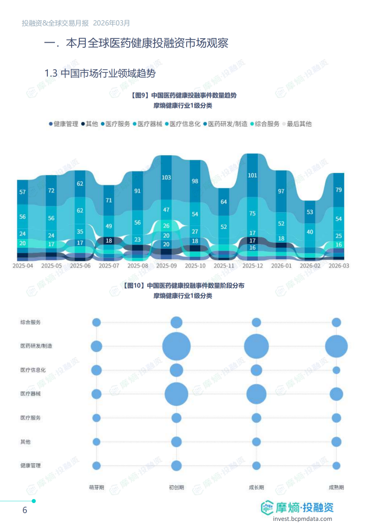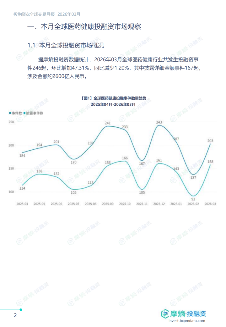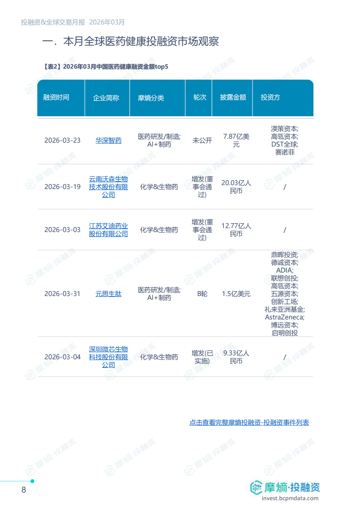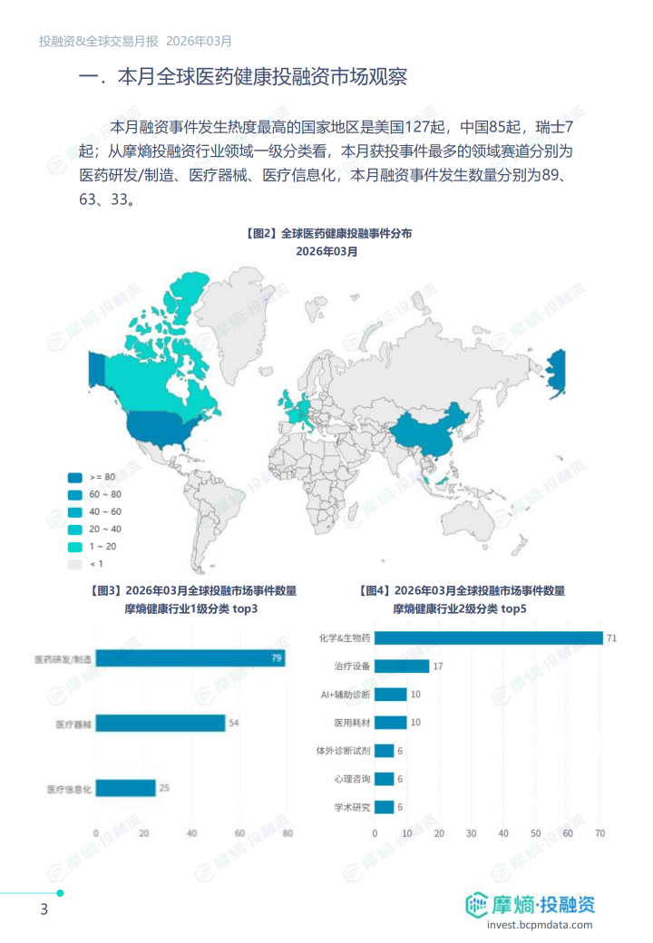 本研报是摩熵投融资主要分析了2026年3月全球和中国医药健康投融资市场的概况、行业领域趋势以及部分重点企业的融资情况。核心观点如下: