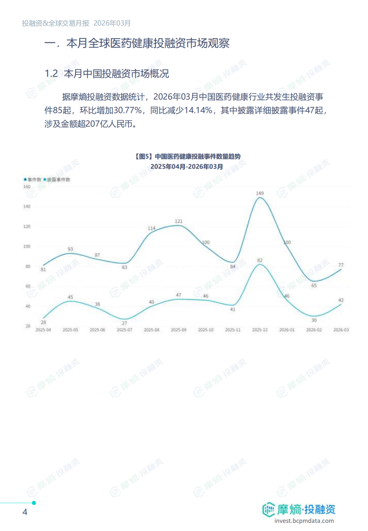 2026年03月中国医药健康行业共发生投融资事件85起,环比增加30.77%,同比减少14.14%,其中披露详细披露事件47起,涉及金额超207亿人民币。
