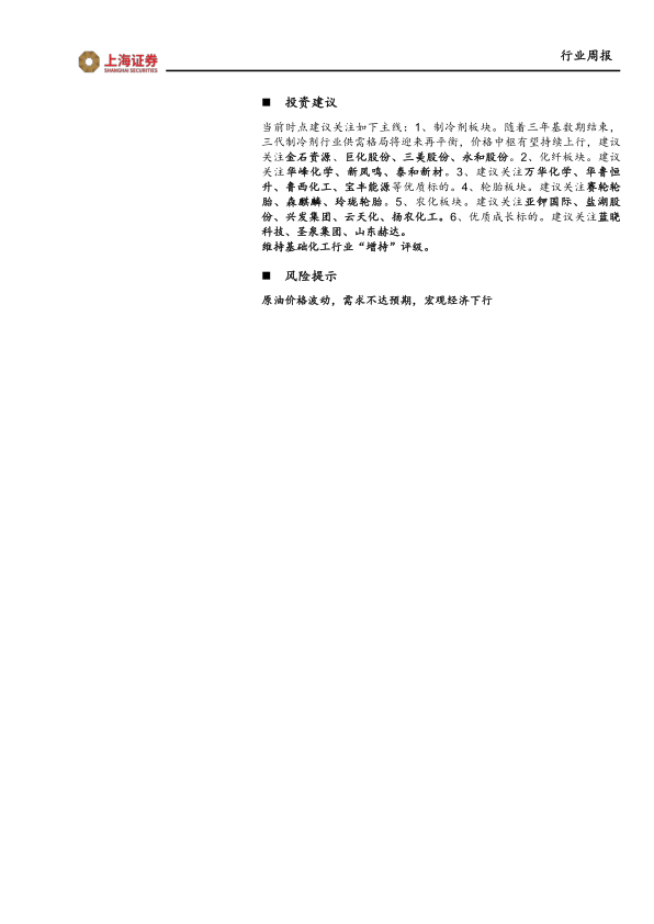 当前时点建议关注如下主线:1、制冷剂板块。随着三年基数期结束,三代制冷剂行业供需格局将迎来再平衡,价格中枢有望持续上行,建议关注金石资源、巨化股份、三美股份、永和股份。2、化纤板块。建议关注华峰化学、新凤鸣、泰和新材。3、建议关注万华化学、华鲁恒升、鲁西化工、宝丰能源等优质标的。4、轮胎板块。建议关注赛轮轮胎、森麒麟、玲珑轮胎。5、农化板块。建议关注亚钾国际、盐湖股份、兴发集团、云天化、扬农化工。6、优质成长标的。建议关注蓝晓科技、圣泉集团、山东赫达。