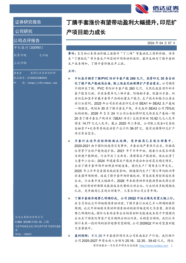 丁腈手套涨价有望带动盈利大幅提升,印尼扩产项目助力成长