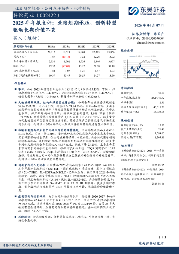 盈利预测与投资评级:由于公司业绩短期承压,我们将2026-2027年的归母净利润从42.4/46.8亿元下调至19.3/23.5亿元,预计2028年归母净利润为30.8亿元,当前市值对应2026-2028年PE为30/24/19倍,公司26年大输液有望企稳回升、原料药与仿制药业务维持稳定,叠加创新药商业化贡献,维持“买入”评级。