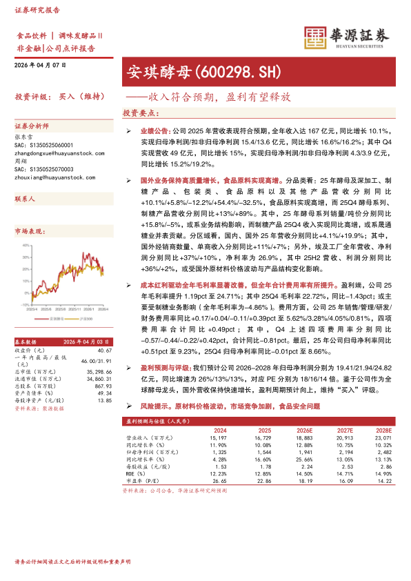 盈利预测与评级:我们预计公司2026-2028年归母净利润分别为19.41/21.94/24.82亿元,同比增速为26%/13%/13%,对应PE分别为18/16/14倍。鉴于公司作为全球酵母龙头,国外营收保持快速增长,盈利周期预计向上,维持“买入”评级。