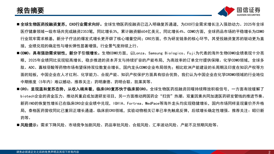 CDMO:具有强劲需求韧性,新分子引领增长。生物CDMO方面,以Lonza、SamsungBiologics、Fuji为代表的海外生物CDMO业绩表现十分亮眼,2025年业绩同比实现较高增长,稳步推进的资本开支与持续扩容的产能布局,为高效率的订单交付提供保障。化学CDMO领域,全球多肽、ADC、寡核苷酸等药物市场有望保持双位数复合增长,国内龙头CDMO企业布局领先;相比欧洲产能建设的长周期及印度在知识产权等方面的短板,中国企业在人才红利、化学能力、合规产能、知识产权保护方面具有综合优势,我们认为中国企业在化学CRDMO领域的行业地位中期维度(5年内)难以撼动。推荐关注:药明康德、药明合联、凯莱英等。