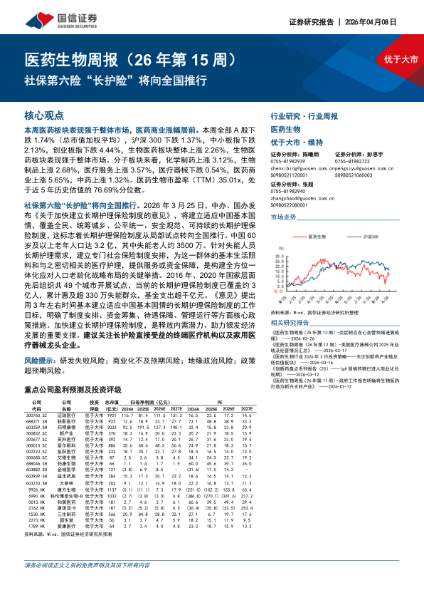 医药生物行业周报(26年第15周):社保第六险“长护险”将向全国推行