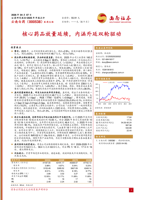 高分红属性延续,创新布局与外延补链共同打开长期空间。公司2025年度利润分配预案为每10股派发现金红利15.83元。结合2025年9月已实施的每10股10.19元的特别分红,全年累计现金红利总额达46.4亿元,占2025年归母净利润的90.1%,高股息资产防御价值突出。公司稳固主业同时,积极布局创新药领域。中短期项目全力布局白药系列、气血康等18个中药大品种的二次开发,在研项目37个,持续推进全三七片、附杞固本膏等创新中药开发;长期项目以核药发展为中心,多条管线进展顺利,诊断性核药INR101已进入III期临床,治疗性核药INR102处于I/IIa期临床。2025年8月,公司对安国市聚药堂的全资收购落地,增厚中药产业链布局,为饮片销售和配方颗粒业务拓展奠定基础,内涵+外延协同并举。