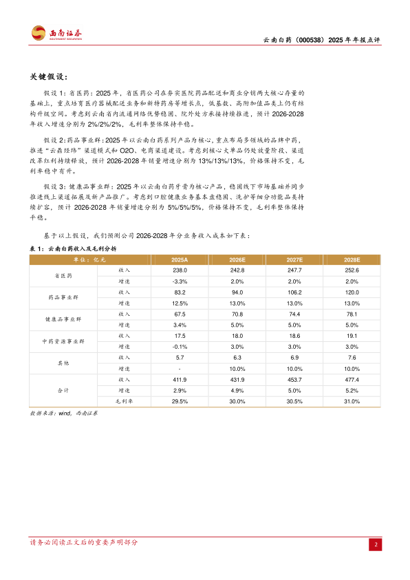 药品事业群延续高增,多品种放量显著。营收端,2025年公司工业营收160.2亿元(+10.7%),占比提高2.8pp至38.9%,整体收入结构进一步向高毛利工业端倾斜。分事业群:1)药品群营收83.2亿元(+12.5%),单品销售过亿产品达10个,其中过10亿元产品2个。核心系列产品收入超55亿元,同比增速超18%;其中白药气雾剂收入突破25亿元,增速超22%;白药膏收入突破12亿元,增速超过26%;白药胶囊、白药散剂等产品均维持高增态势。第二梯队产品快速放量,气血康同比增长约68%,参苓健脾胃颗粒同比增长超53%,多款产品收入突破亿元。2)健康品群营收67.5亿元(+3.4%),实现利润20.9亿元(-4.6%)。白药牙膏市占率稳居第一;养元青收入4.6亿元,同比增速近10%;健康品板块线上销量同比显著提升27%。3)中药资源群对外营收17.5亿元(-0.1%),各业务单元协同发力稳住基本盘。4)省医药营收238.0亿元(-3.3%),净利润7.67亿元(+24.2%)。医疗器械、药妆、特医食品业务销售收入同比+11.7%;承接院内处方外流的新特药房业务销售收入同比+38.5%。