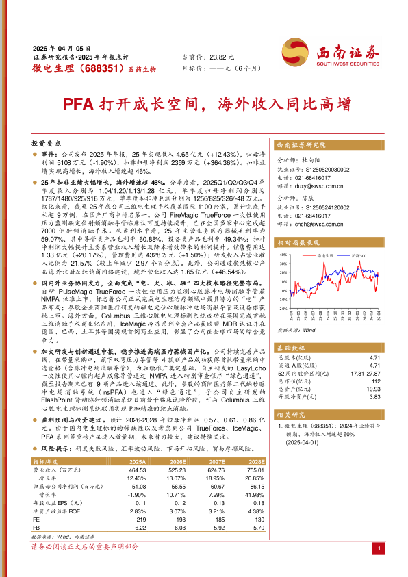 盈利预测与投资建议。预计2026-2028年归母净利润0.57、0.61、0.86亿元。由于国内电生理标的的稀缺性以及考虑到公司TrueForce、IceMagic、PFA系列等重磅产品进入放量期,未来潜力较大,建议持续关注。