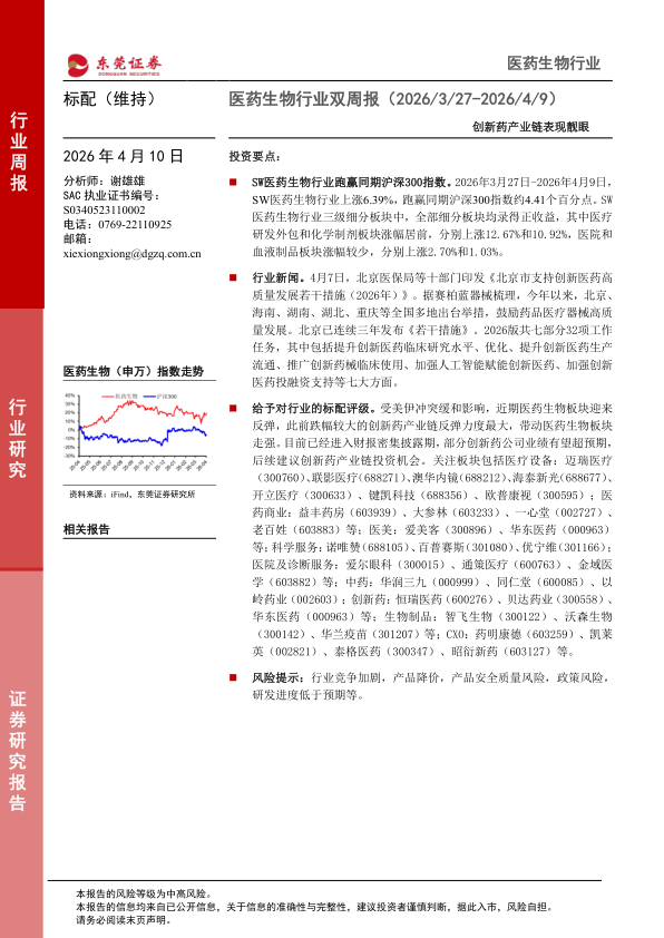 给予对行业的标配评级。受美伊冲突缓和影响,近期医药生物板块迎来反弹,此前跌幅较大的创新药产业链反弹力度最大,带动医药生物板块走强。目前已经进入财报密集披露期,部分创新药公司业绩有望超预期,后续建议创新药产业链投资机会。关注板块包括医疗设备:迈瑞医疗(300760)、联影医疗(688271)、澳华内镜(688212)、海泰新光(688677)开立医疗(300633)、键凯科技(688356)、欧普康视(300595);医药商业:益丰药房(603939)、大参林(603233)、一心堂(002727)、老百姓(603883)等;医美:爱美客(300896)、华东医药(000963)等;科学服务:诺唯赞(688105)、百普赛斯(301080)、优宁维(301166);医院及诊断服务:爱尔眼科(300015)、通策医疗(600763)、金域医学(603882)等;中药:华润三九(000999)、同仁堂(600085)、以岭药业(002603);创新药:恒瑞医药(600276)、贝达药业(300558)华东医药(000963)等;生物制品:智飞生物(300122)、沃森生物(300142)、华兰疫苗(301207)等;CXO:药明康德(603259)、凯莱英(002821)、泰格医药(300347)、昭衍新药(603127)等。