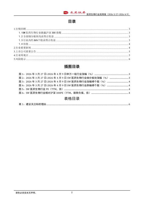 SW医药生物行业跑赢同期沪深300指数。2026年3月27日-2026年4月9日,SW医药生物行业上涨6.39%,跑赢同期沪深300指数约4.41个百分点。SW医药生物行业三级细分板块中,全部细分板块均录得正收益,其中医疗研发外包和化学制剂板块涨幅居前,分别上涨12.67%和10.92%,医院和血液制品板块涨幅较少,分别上涨2.70%和1.03%。