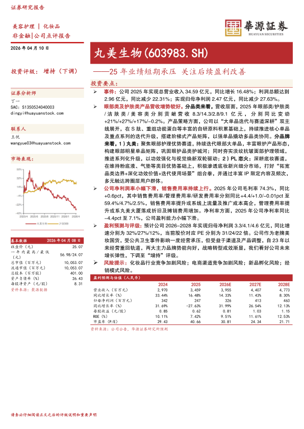盈利预测与评级:预计公司2026-2028年实现归母净利润3.3/4.1/4.6亿元,同比增速分别为32%/27%/12%,当前股价对应PE分别为31/24/22倍。公司作为老牌美妆国货,受公共卫生事件影响一度经营承压,但受益于渠道及产品调整,自23年以来经营重回轨道,两大主力品牌势能向好,战略转型成效渐显,我们看好公司未来增长弹性,下调至“增持”评级。