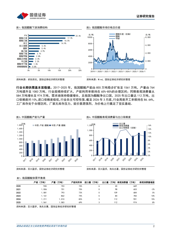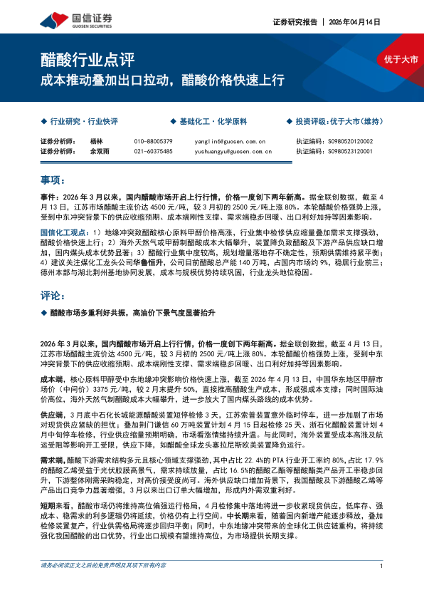 事件:2026年3月以来,国内醋酸市场开启上行行情,价格一度创下两年新高。据金联创数据,截至4月13日,江苏市场醋酸主流价达4500元/吨,较3月初的2500元/吨上涨80%。本轮醋酸价格强势上涨,受到中东冲突背景下的供应收缩预期、成本端刚性支撑、需求端稳步回暖、出口利好加持等因素影响。