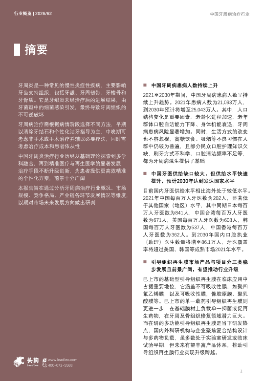本报告旨在通过分析牙周病治疗行业概况、市场规模、竞争格局、产业链各环节发展情况等维度,以期对市场未来发展方向做出研判