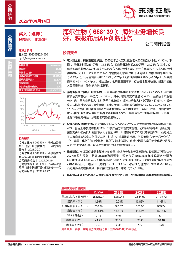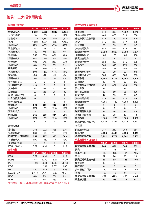 投资建议:考虑到行业需求复苏节奏较慢、市场竞争加剧等因素影响,我们适当下调2026-2027年盈利预测,新增2028年盈利预测,预计公司2026-2028年实现营收分别为25.63/28.42/31.74亿元,归母净利润分别为2.87/3.20/3.69亿元(2026-2027年原预测为4.81/5.62亿元),对应EPS分别为0.91/1.01/1.17元,对应PE分别为36.59/32.83/28.48倍公司海外业务增长良好,积极拓展创新业务,维持“买入”评级。