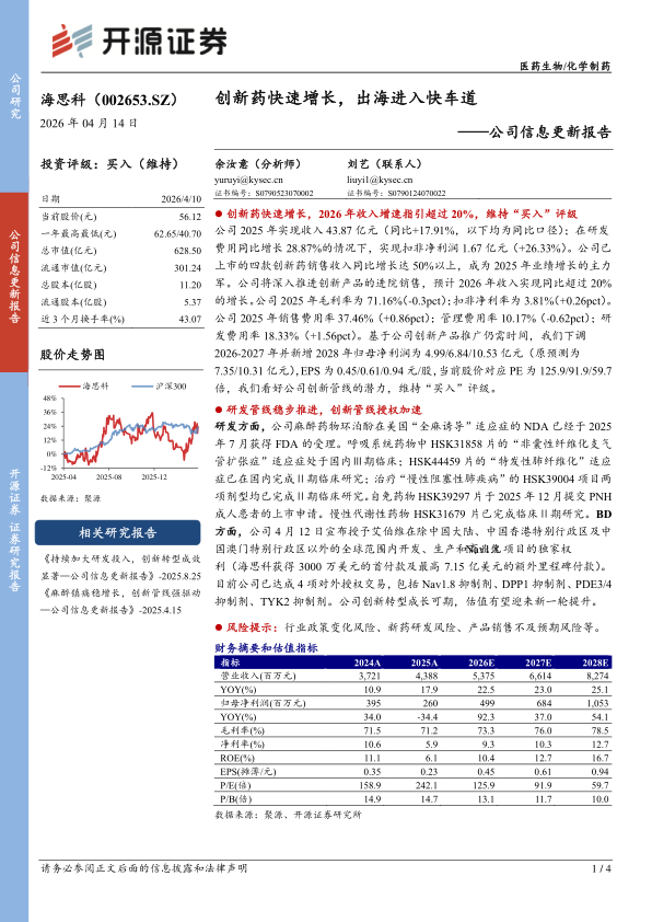 研发方面,公司麻醉药物环泊酚在美国“全麻诱导”适应症的NDA已经于2025年7月获得FDA的受理。呼吸系统药物中HSK31858片的“非囊性纤维化支气管扩张症”适应症处于国内Ⅲ期临床;HSK44459片的“特发性肺纤维化”适应症已在国内完成Ⅱ期临床研究;治疗“慢性阻塞性肺疾病”的HSK39004项目两项剂型均已完成Ⅱ期临床研究。自免药物HSK39297片于2025年12月提交PNH成人患者的上市申请。慢性代谢性药物HSK31679片已完成临床Ⅱ期研究。BD方面,公司4月12日宣布授予艾伯维在除中国大陆、中国香港特别行政区及中国澳门特别行政区以外的全球范围内开发、生产和商业化Nav1.8项目的独家权利(海思科获得3000万美元的首付款及最高7.15亿美元的额外里程碑付款)。目前公司已达成4项对外授权交易,包括Nav1.8抑制剂、DPP1抑制剂、PDE3/4抑制剂、TYK2抑制剂。公司创新转型成长可期,估值有望迎来新一轮提升。