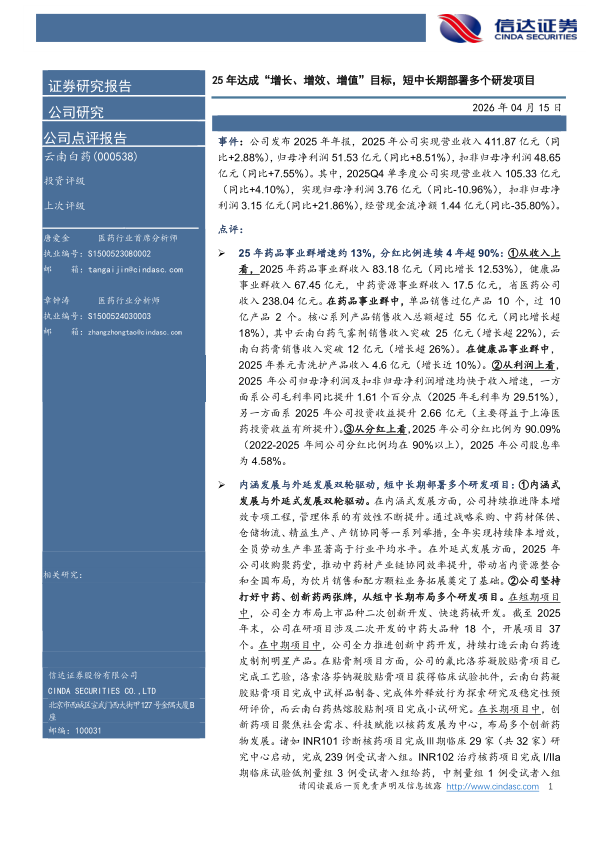 内涵发展与外延发展双轮驱动,短中长期部署多个研发项目:①内涵式发展与外延式发展双轮驱动。在内涵式发展方面,公司持续推进降本增效专项工程,管理体系的有效性不断提升。通过战略采购、中药材保供、仓储物流、精益生产、产销协同等一系列举措,全年实现持续降本增效,全员劳动生产率显著高于行业平均水平。在外延式发展方面,2025年公司收购聚药堂,推动中药材产业链协同效率提升,带动省内资源整合和全国布局,为饮片销售和配方颗粒业务拓展奠定了基础。②公司坚持打好中药、创新药两张牌,从短中长期布局多个研发项目。在短期项目中,公司全力布局上市品种二次创新开发、快速药械开发。截至2025年末,公司在研项目涉及二次开发的中药大品种18个,开展项目37个。在中期项目中,公司全力推进创新中药开发,持续打造云南白药透皮制剂明星产品。在贴膏剂项目方面,公司的氟比洛芬凝胶贴膏项目已完成工艺验,洛索洛芬钠凝胶贴膏项目获得临床试验批件,云南白药凝胶贴膏项目完成中试样品制备、完成体外释放行为探索研究及稳定性预研评价,而云南白药热熔胶贴剂项目完成小试研究。在长期项目中,创新药项目聚焦社会需求、科技赋能以核药发展为中心,布局多个创新药物发展。诸如INR101诊断核药项目完成Ⅲ期临床29家(共32家)研究中心启动,完成239例受试者入组。INR102治疗核药项目完成I/IIa期临床试验低剂量组3例受试者入组给药,中剂量组1例受试者入组给药,2例受试者完成INR101筛选。