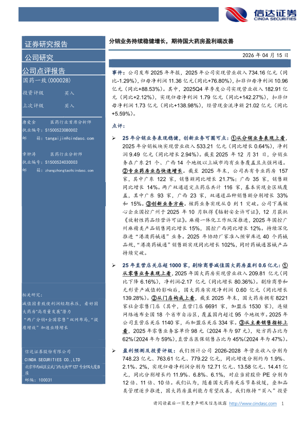 分销业务持续稳健增长,期待国大药房盈利端改善