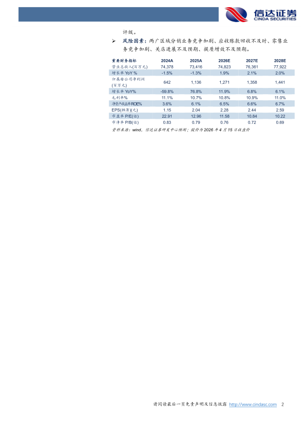 风险因素:两广区域分销业务竞争加剧、应收账款回收不及时、零售业务竞争加剧、关店进展不及预期、提质增效不及预期。