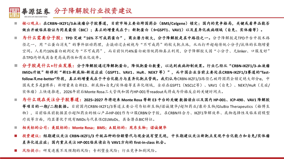 投资建议:短期建议关注CRBN-IKZF1/3升级品种的份额替代与现金流有望兑现,中长期建议关注新靶点发现平台化能力和自免/实体瘤差异化适应症;国内重点关注HP-001临床读出与VAV1方向的first-in-class机会。