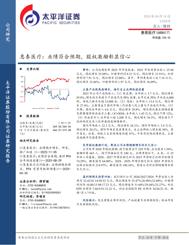 盈利预测及投资评级:我们预计公司2026/2027/2028年营业收入分别为32.42/41.14/50.52亿元,同比增速为25.47%/26.90%/22.80%;归母净利润为10.80/13.98/17.23亿元,同比增速为31.60%/29.44%/23.27%。对应EPS分别为7.66/9.91/12.22元,对应当前股价PE分别为34/26/21倍,维持“买入”评级。