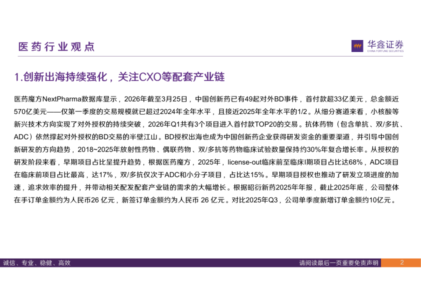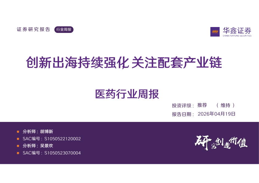 2026年中国创新出海趋势持续强化,同时市场对创新药配置有望回升,维持医药行业“推荐”的评级,具体的推选方向和选股思路如下: