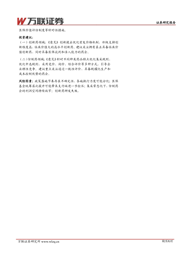 (一)创新药领域:《意见》创新提出优化首发价格机制,积极支持创新程度高、临床价值大的高水平创新药。建议关注拥有真正具备临床价值创新药、同时具备医保谈判和准入能力的药企。