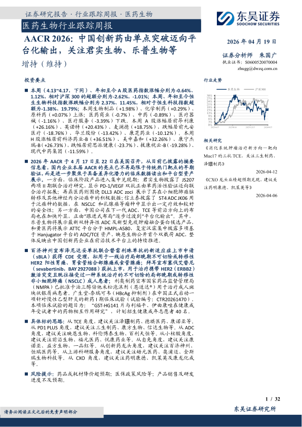 医药生物行业跟踪周报:AACR 2026:中国创新药由单点突破迈向平台化输出,关注君实生物、乐普生物等
