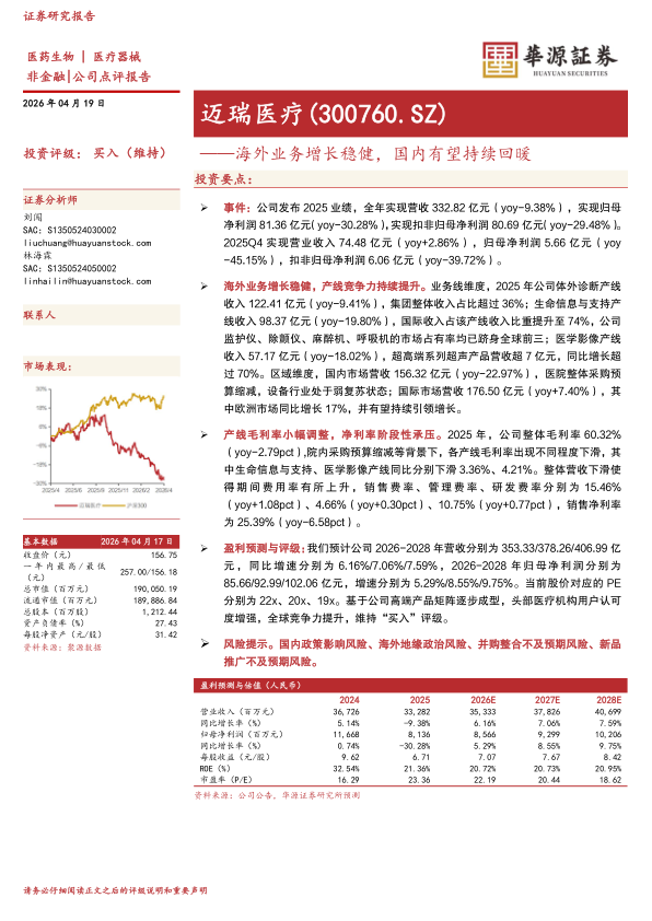 盈利预测与评级:我们预计公司2026-2028年营收分别为353.33/378.26/406.99亿元,同比增速分别为6.16%/7.06%/7.59%,2026-2028年归母净利润分别为85.66/92.99/102.06亿元,增速分别为5.29%/8.55%/9.75%。当前股价对应的PE分别为22x、20x、19x。基于公司高端产品矩阵逐步成型,头部医疗机构用户认可度增强,全球竞争力提升,维持“买入”评级。