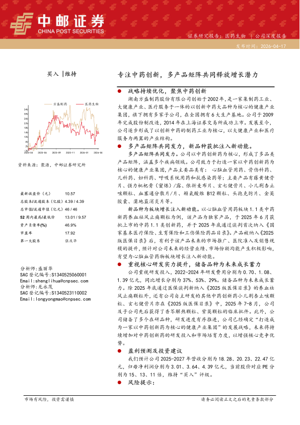 公司重视研发投入,2022-2024年研发费用分别为0.70、1.08、1.39亿元,同比增长分别为37%、53%、29%。储备品种为未来成长蓄力。除2025年底通过医保谈判新纳入《2025版医保目录》的养血祛风止痛颗粒外,还有公司自主研发的其他中药创新药小儿荆杏止咳颗粒、玄七健骨片亦在《2025版医保目录》中,2025年7-8月,公司及子公司先后获得了香芩解热颗粒、紫英颗粒的临床批件。此外,公司储备了多个在研品种,研发进度有序推进,公司已经确定“打造成为一家以中药创新药为核心的健康产业集团”的发展战略,未来将持续增加对中药创新药的研发投入和市场培育力度,以增强核心竞争优势。