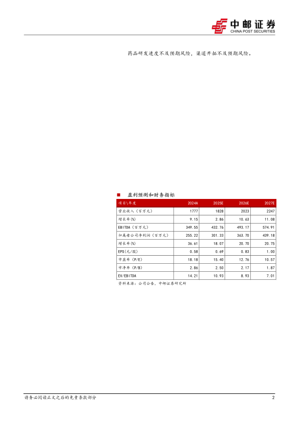 药品研发进度不及预期风险,渠道开拓不及预期风险。