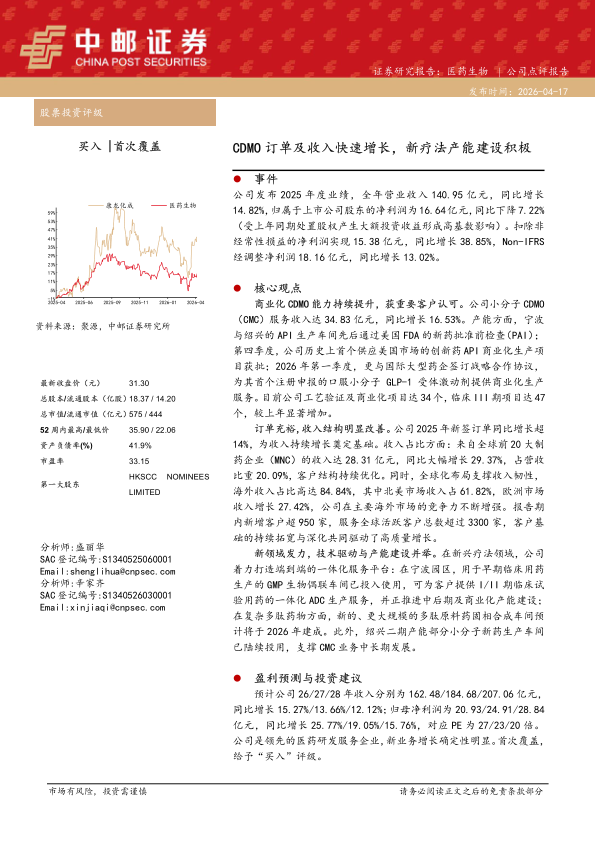 预计公司26/27/28年收入分别为162.48/184.68/207.06亿元,同比增长15.27%/13.66%/12.12%;归母净利润为20.93/24.91/28.84亿元,同比增长25.77%/19.05%/15.76%,对应PE为27/23/20倍。公司是领先的医药研发服务企业,新业务增长确定性明显。首次覆盖,给予“买入”评级。